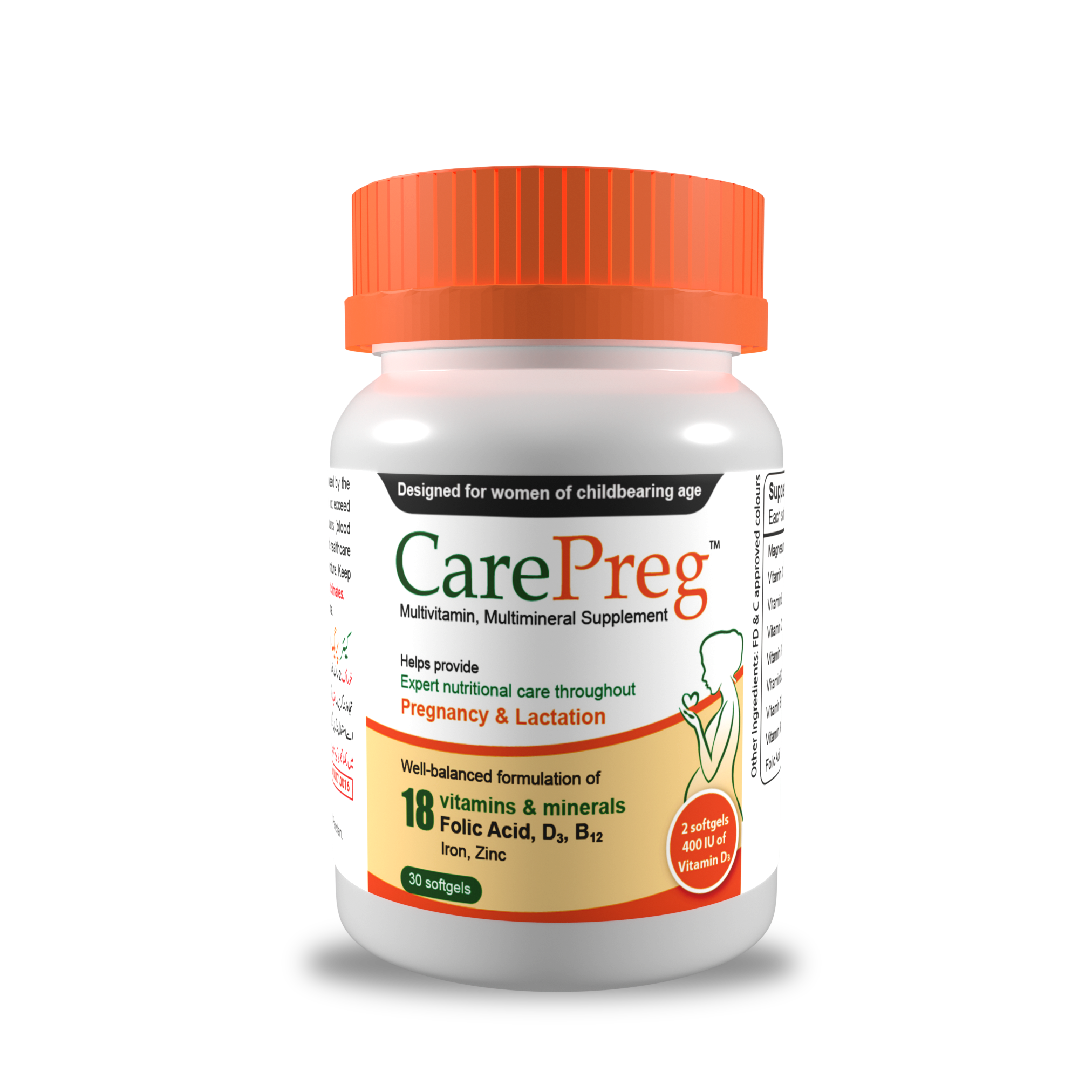 Carepreg combines magnesium, vitamin D3, vitamin E, vitamin C, B-complex vitamins, folic acid, iron, zinc, selenium, iodine, biotin, and copper to support maternal health including energy production, fetal development, immune function, and red blood cell formation during pregnancy.