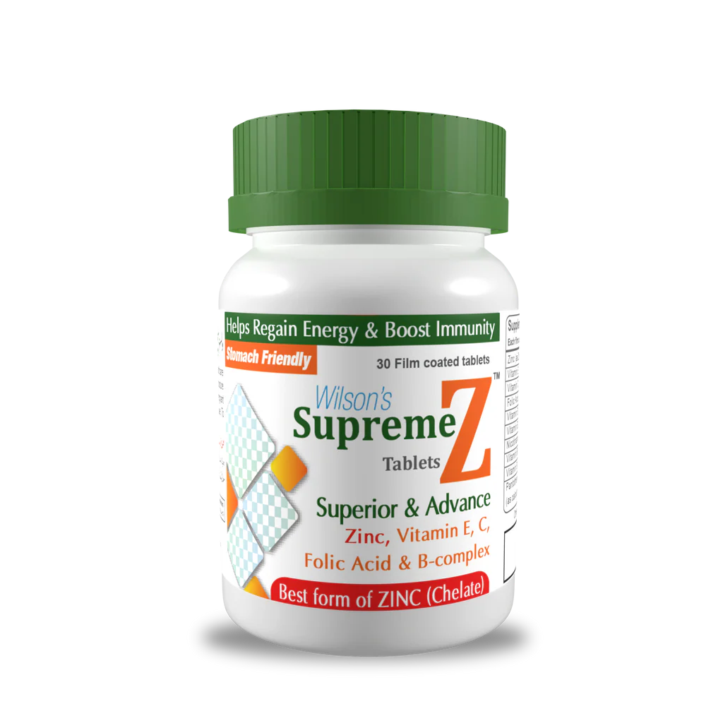 Supreme Z delivers high-potency zinc, vitamins C & E, folate and a complete B-complex (B1, B2, B3, B5, B6, B12) to support immunity, energy metabolism, antioxidant defence, brain and nerve function, red blood cell formation, healthy skin and collagen, and men’s reproductive health—balanced coverage for busy, high-stress days.